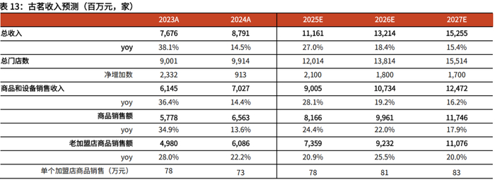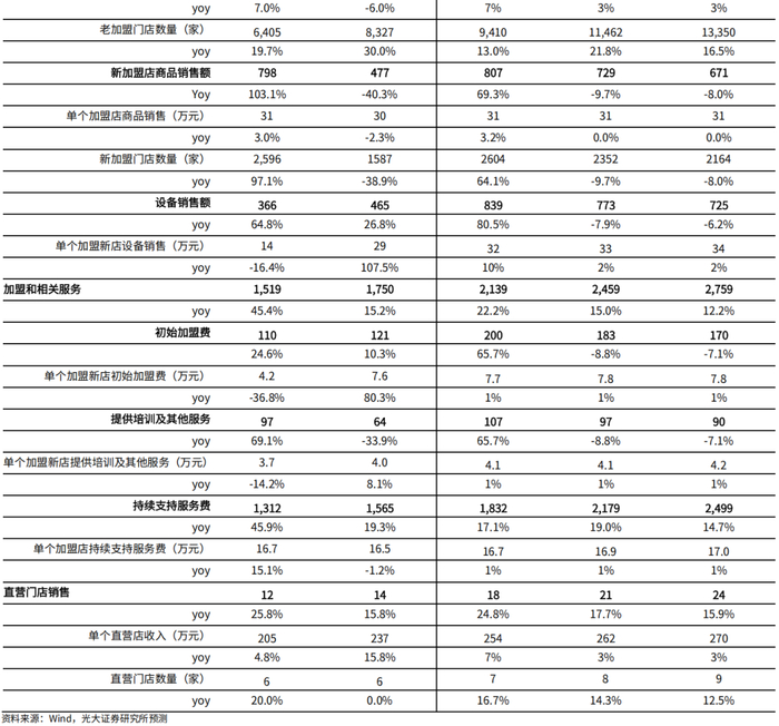 1)商品销售:我们根据披露的新店和老店GMV占比来估计新店和老店商品销售额的占比,门店同店销售额增速估计与老店商品销售额增速相当。①对于老店(定义为非当年新开的门店),考虑到25年1-4月门店同店销售额增速较快,同店销售额基本回到2023年水平(2024年受行业价格战以及“315”事件影响,同店销售额基数较低),我们预计公司2025年老店单店商品销售额与2023年相近,对应增速为7%;预计2026-2027年老店单店商品销售额增速保持平稳,为3%。②对于新店(定义为当年新开的门店),考虑到过去3年新店的单店商品销售额差别不大,我们假设2025-2027年新店单店商品销售额维持在2023年水平,对应2025-2027年增速分别为3.2%/0%/0%。综合来看,预计2025-2027年公司商品销售额增速分别为24.4%/22.0%/17.9%。2)设备销售:设备销售主要发生在新店开业,因此该业务收入与新店数量及设备单价有关。公司2025年调整加盟政策,设备采用分期付款,加上新增咖啡机带来的影响,预计2025单个新店设备销售额增速较快,预计2025-2027年单个新店设备销售额增速分别为10%/2%/2%。预计公司2025-2027年设备销售收入增速分别为80.5%/-7.9%/-6.2%。3)加盟和相关服务:主要包括初始加盟费、培训服务费、持续支持服务费用等,预计随着门店数量增速的放缓和基数的增大,该业务收入增速逐年下降,预计2025-2027年该业务收入增速分别为22.2%/15.0%/12.2%。4)直营门店销售:直营门店和加盟门店终端销售的产品无差异,且以老店为主,假设2025-2027年单个直营店销售额增速与单个老加盟店商品销售额增速一致,分别为7%/3%/3%。直营门店非公司发展重点,假设2025-2027年平均每年增加1家直营店。综合看,预计2025-2027年直营门店收入增速分别为24.8%/17.7%/15.9%。