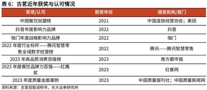 公司近年来获得一系列奖项,受到多方高度认可。长期以来,古茗在对产品与服务质量的不懈追求中赢得了市场认可,在现制茶饮行业乃至餐饮业中具有较高的知名度及美誉度,市场影响力强大。