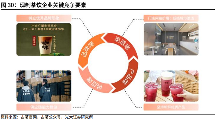 供应端:保证稳健的供应链能力。由于原料的新鲜程度和质量对于饮品口感具有很大影响,是否具有稳健的供应链能力是现制茶饮品牌重点关注的因素,包括原料采购、加工、仓储物流和冷链能力等多个方面。