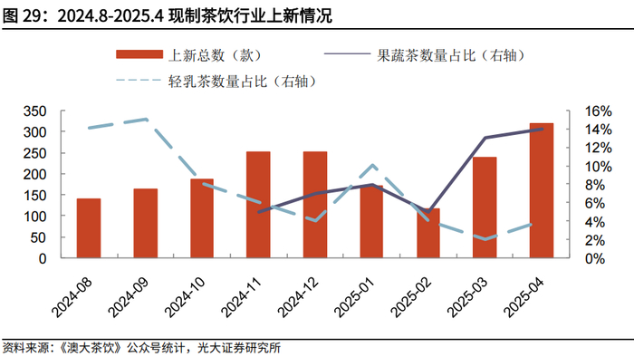 此外,健康化、新鲜化亦逐步成为现制茶饮的消费趋势。2024年,喜茶创新推出“羽衣纤体瓶”,上线一个半月销量超过1000万瓶,成为爆款产品。随后一众新茶饮品牌围绕“蔬菜+水果+茶”的创新搭配,将羽衣甘蓝、西芹、胡萝卜等蔬菜融入到产品中。从现制茶饮新品趋势看,果蔬产品款数占比逐步提升,轻乳茶款数经过24年高峰后,25年逐步回落。