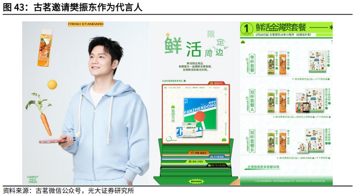 邀请大牌体育明星作为产品代言人,强化品牌影响力。古茗于2025年3月26日正式宣布邀请樊振东作为果蔬汁类产品代言人,以其阳光、自律、健康的公众形象宣传古茗的健康饮品理念,意在树立全新品牌形象,并积极拓展在健康饮品类别中的影响力。