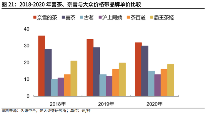 2021年前,国内茶饮市场价格差异较大,品牌档次区别明显。随着市场对于新式茶饮体验的需求不断增长,国内的高端现制茶饮市场蓬勃发展,自2015年始保持了较高速度的增长,2015-2020年其规模CAGR高达74.4%,以喜茶、奈雪为代表的高端茶饮品牌表现突出。同时,其产品单价较之于中低端茶饮品牌高出一倍左右,在价格上存在明显的分层。2020年及之前,高端茶饮品牌平均单价大幅领先,而中低端茶饮品牌则在门店覆盖范围和数量上具备显著优势,总体呈现出差异化竞争格局。