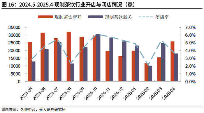 现制茶饮行业门店更迭较快,25Q1闭店率环比放缓。现制茶饮行业开店和闭店数量常年维持较高水平,其中月度闭店数量基本在1万家店以上。与24Q4相比,25Q1闭店率有所下降,行业竞争格局环比趋稳。