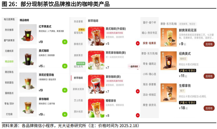 随着茶饮行业逐渐饱和,各茶饮品牌开始瞄向咖啡赛道。瑞幸咖啡作为国内现制咖啡行业的领跑者,近三年门店数量增加了两倍以上,同时盈利能力在扭亏为盈的基础上实现了显著提升。瑞幸在现制咖啡领域的成功先例,加上现制茶饮行业的激烈竞争态势,共同促使主流茶饮品牌“另辟蹊径”,尝试进军现制咖啡赛道。茶颜悦色于2022年8月推出咖啡品牌“鸳央咖啡”,茶百道和沪上阿姨也于2023年陆续新增咖啡产品,古茗亦于2024年开始涉足咖啡产品,目前大多数主流现制茶饮店均有不同程度地涉足咖啡产品。