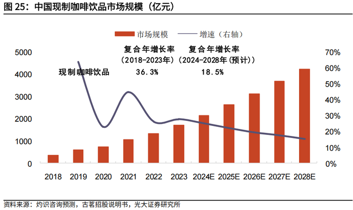 现制咖啡饮品市场规模在2018-2023年由366亿元增长至1,721亿元,复合年增长率为36.3%,预计到2028年将达到4,242亿元,预计2024-2028年复合年增长率为18.5%。咖啡饮品是中国现制饮品市场中增长最快的细分市场,消费咖啡饮品的习惯在中国日益盛行,受欢迎程度持续上升。