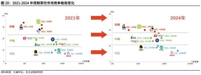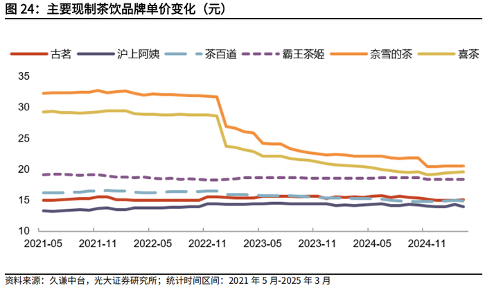 2021年以来现制茶饮市场竞争格局总体表现为价格带持续挤压,目前档次区分度有再度扩大趋势。在2021年及以前现制茶饮品牌价格区分度较大,以喜茶、奈雪的茶为代表的高端品牌产品单价普遍在30元以上。在2021年后,高端品牌竞相下调产品单价,逐步向中档挤压,加剧了价格竞争。2024年下半年以来,高端品牌价格出现回升趋势,档次区分度或将再度拉大。