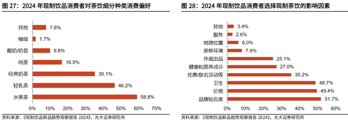 行业下沉市场空间大,供应链打造核心竞争力。根据灼识咨询数据,按GMV统计,2024年中国现制饮品行业拥有超过6000亿元的市场规模,其中现制茶饮行业规模最大(超过3000亿元),现制咖啡行业增速较快(24-28年CAGR预计为18.5%)。按城市线级划分来看,低线市场具有更大的增长潜力,预计三线及以下城市24-28年CAGR均超过20%。按价格带划分来看,大众价格带产品增长势头最好,预计24-28年CAGR为20.8%。从企业各项能力看,供应链为最核心的竞争力。