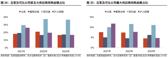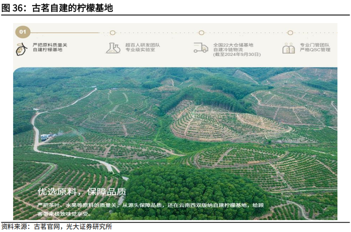 公司优先选择资质齐全、实力较强、口碑良好的供应商。古茗设有采购中心负责筛选供应商,供应链团队与产品研发团队合作紧密,能够更好地确定优质供应商,并与之逐步加强合作。公司对单一或个别供应商依赖度较低,其五大供应商在采购总额中的占比基本不高于20%,最大供应商占比低于10%。公司长期严把茶叶、水果等原料质量关,并在云南西双版纳自建供应基地。