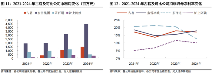 古茗盈利能力逐年增强,净利率大幅增长。横向比较来看,2023-2024年古茗的扣非后归母净利率基本保持在17%-18%之间,扣非后归母净利率已接近行业龙头蜜雪冰城。若看净利润,古茗净利润由2021年的0.24亿元增长至2024年的14.93亿元,CAGR高达296%。