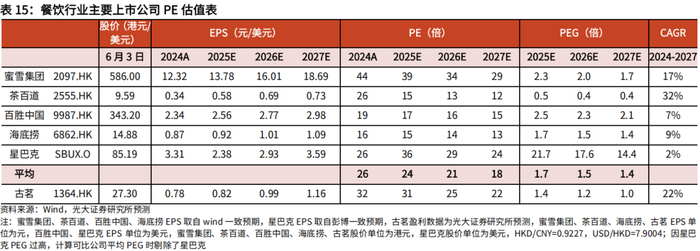 蜜雪集团、茶百道、星巴克均为茶饮、咖啡类上市公司,可以作为有相似业务的可比公司,为丰富可比公司数量,我们另选取了餐饮公司百胜中国、海底捞作为可比公司。2025-2027年可比公司平均PE分别为24x/21x/18x,古茗PE高于行业平均;2025-2027年可比公司PEG平均估值分别为1.7x/1.5x/1.4x(不含星巴克),古茗2025-2027年PEG低于行业平均水平。古茗门店在全国各城市的覆盖度仍较低,未来拓店还有较大空间,未来PEG估值有望向行业均值靠拢。