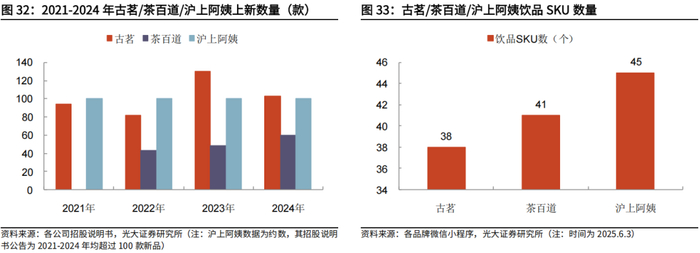 公司产品策略灵活,通过跟进式创新不断推动产品上新。古茗及时追踪最新的消费者偏好趋势,并通过供应链加持快速捕捉市场风口,以跟进式创新不断开发出受市场欢迎的产品。同时,古茗亦具备强大的食品研发团队,在产品原料的使用和搭配上不断进行尝试与创新。2021-2024年,古茗分别推出了多达94/82/130/103款新品。尽管公司上新数量多,但相比起同业古茗菜单更精简。古茗通过不断推新来持续满足消费者的新鲜感,但同时通过控SKU数量保证整体运营效率。