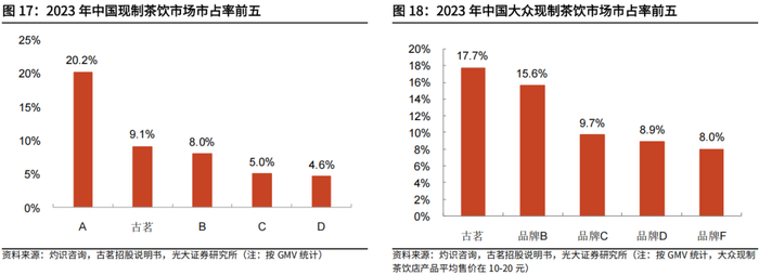 中国现制茶饮市场集中度持续提升。根据灼识咨询报告,截至2023年底,按GMV统计,现制茶饮市场的CR5为46.8%,较之2020年提升8.3个百分点。按2023年市场份额计,古茗在中国现制茶饮店品牌中排名第二,拥有9.1%的市场份额;古茗在中国大众现制茶饮店品牌中排名第一,拥有17.7%的市场份额。