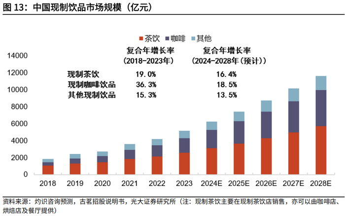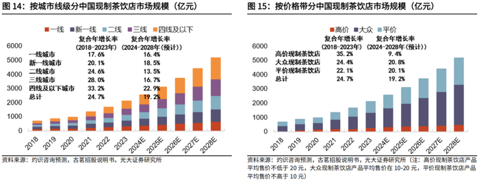 根据灼识咨询报告,现制茶饮店市场规模在2018-2023年由702亿元增长至2115亿元,复合年增长率为24.7%,预计到2028年市场规模将达到5193亿元,预计2024-2028年复合年增长率为19.2%。按城市线级划分来看,中低线城市和地区具有更大的增长潜力。按价格带划分来看,大众和平价价格带的产品预期将成为现制茶饮店市场的主流(高价现制茶饮店产品平均售价不低于20元,大众现制茶饮店产品平均售价在10-20元,平价现制茶饮店产品平均售价不高于10元)。目前,现制茶饮日益受到欢迎,成为人们日常工作及休闲生活的重要饮品,是现制饮品市场中最大的细分市场。