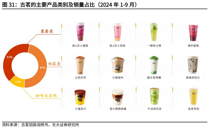 新鲜产品占比高,上新速度快满足消费者多变的需求。古茗的产品中以鲜果、鲜奶制作的产品销量占比较高,且产品性价比高,符合当前消费者对健康化和高质价比的追求。同时公司研发能力强,保持较快的上新速度,有效捕捉市场热门需求。