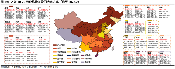 现制茶饮市场10-20元价格带呈现三足鼎立的格局,兼有地域性强势品牌。根据10-20元价格带的主要现制茶饮品牌的门店分布及占有率情况,目前古茗、沪上阿姨和书亦烧仙草三大品牌的门店市占率领先,分别在东南、北方和西南地区的多个省份位列第一。除上述三大品牌之外,其余省份亦有地域性龙头品牌,并拥有较高的门店市占率,如在河南和北京占优的茶百道、在河北占优的益禾堂等。