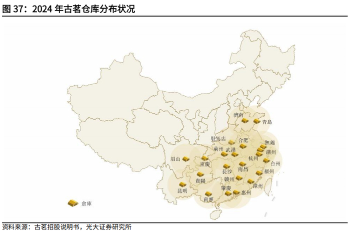 公司的仓储及物流管理能力强大,全程冷链运输。古茗拥有规模庞大的仓储及物流基础设施,在中国现制茶饮店品牌中居于第一梯队。截至2024年底,古茗运营22个仓库,总建筑面积约22万平方米,冷库库容超6万立方米。约有75%的古茗门店位于特定仓库150公里范围内,加之强大物流基础设施的支持,能保障新鲜原料的稳定配送。古茗基本不使用第三方运营的仓储服务,直接运营自身仓库网络以更好满足变化的业务需求。