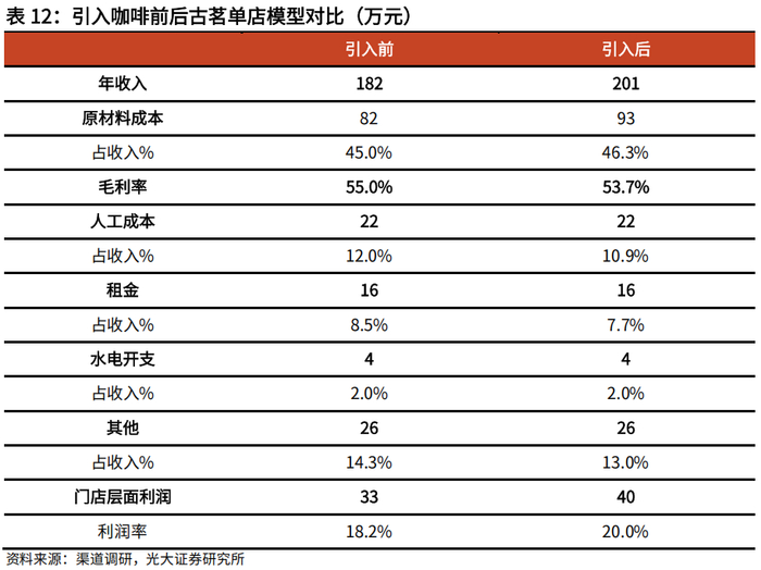 顺应行业发展,古茗进军平价咖啡市场。古茗的咖啡产品在公司战略定位中具有重要的地位。目前咖啡产品在门店的销售比例已经上升至10%-15%,共提供5-6款咖啡产品。古茗非常注重咖啡豆的质量,坚持使用60元/千克的咖啡豆原料,而通过提升物流效率将鲜奶的价格从10元/升压至7元/升以实现整体的成本控制,在保证性价比的同时维持咖啡风味的稳定,使其咖啡产品具有较强的竞争力。