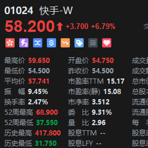 6月6日消息,港股快手午后一度涨超9%,截止发稿涨6.79%,报58.2港元,成交额61.09亿港元。