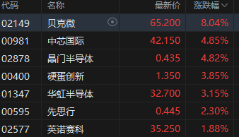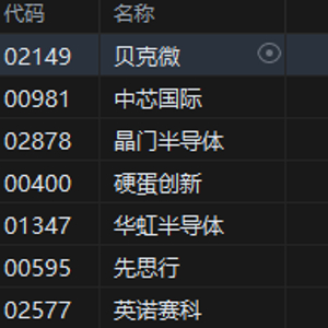 6月9日消息,港股半导体股拉升上涨,其中,贝克微涨超8%,中芯国际、晶门半导体涨近4%,华虹半导体涨3%,先思行涨2.3%。