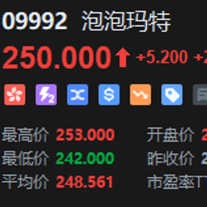 泡泡玛特盘中涨超3%,报价253港元,股价再创新高。现涨超2%报250港元,成交额25.44亿港元。