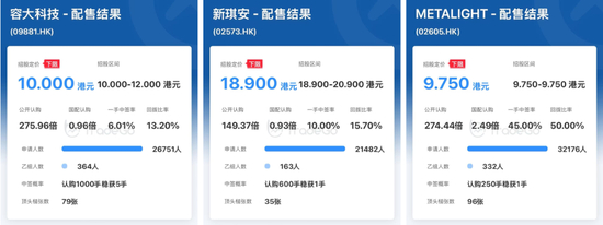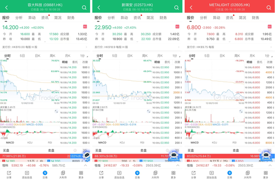 6月10日,容大科技(9881.HK)、新琪安(2573.HK)、METALIGHT(2605.HK)同一天登陆港交所,其中2只新股大涨,1只新股大跌,最终都上演了一场“比比谁跑得快”的比赛。