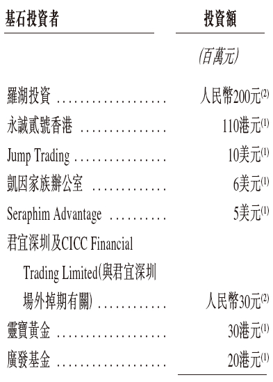 周六福是次IPO招股引入8名基石投资者,合共认购约5.73亿港元的发售股份,基石投资者包括深圳罗湖区国资投资平台罗湖投资认购人民币2亿元,永诚资本通过永诚贰号香港认购1.10亿港元,Jump Trading认购1000万美元,凯因家族办公室认购600万美元,ACCF Capital通过Seraphim Advantage认购500万美元,君宜深圳认购人民币3000万元,灵宝黄金(03330.HK)认购3000万港元,广发基金认购2000万港元。