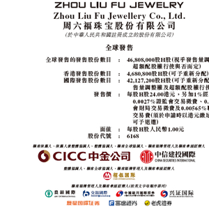 周六福是次IPO,中金公司、中信建投国际为其联席保荐人、整体协调人、联席全球协调人,招银国际为其整体协调人、联席全球协调人,其他包销商包括农银国际、交银国际、中国银河国际、兴证国际、复星国际证券、富途证券、老虎证券。