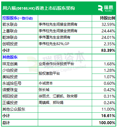 招股书显示,周六福在上市后的股东架构中,李伟柱先生通过若水联合、上善联合、创明投资合计持股59.38%,一致行动人李伟蓬先生(李伟柱先生的胞兄)通过乾坤联合持股24.01%,合计持股约83.39%。