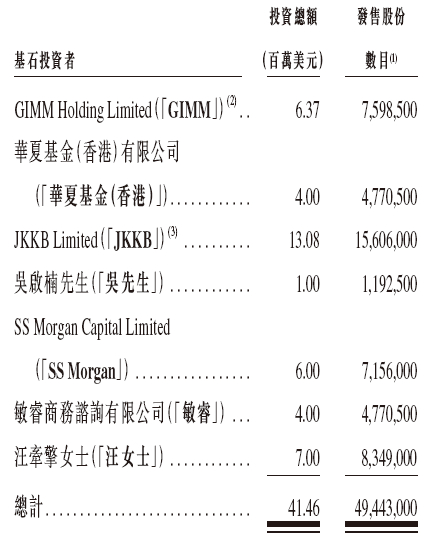 圣贝拉是次IPO招股引入7名基石投资者,合共认购约4146万美元(约3.25亿港元)的发售股份,基石投资者包括58同城CEO梁铭枢先生及58同城通过GIMM认购637万美元,华夏基金认购400万美元,萧山经开区国资基金通过JKKB认购1308万美元,和睦家医疗CEO吴启楠先生认购100万美元,港生源创始人曾淇女士通过SS Morgan认购人民币600万美元,秦天宇先生通过敏睿认购400万美元,原素医美创始人汪牵擎女士认购700万美元。