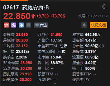 6月23日,生物科技公司药捷安康-B正式登陆港交所,开盘后股价急速攀升。盘中涨幅一度扩大至80%,最高触及23.7港元,较发行价13.15港元高10.55港元。不计手续费,每手赚近5300港元,公司总市值跃升至94亿港元。截止发稿,药捷安康-B涨73.76%,报价22.85港元。