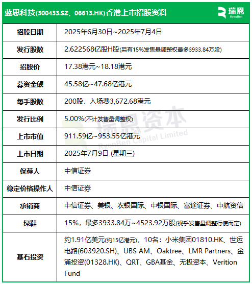 蓝思科技香港上市招股,小米、橡树、UBS、LMR、无极资本等参与基石投资