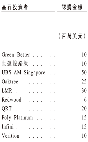 蓝思科技是次IPO招股引入10名基石投资者,合共认购约1.91亿美元(约14.99亿港元)的发售股份,基石投资者包括小米集团(01810.HK)旗下Green Better认购1000万美元,世运电路(603920.SH)旗下世运线路板认购1000万美元,UBS AM认购5000万美元,Oaktree认购2500万美元,LMR认购3000万美元,金涌投资(01328.HK)旗下Redwood认购600万美元,QRT认购2000万美元、GBA基金通过Poly Platinum认购1500万美元,无极资本通过Infini认购1500美元、Verition Fund认购1000万美元等。