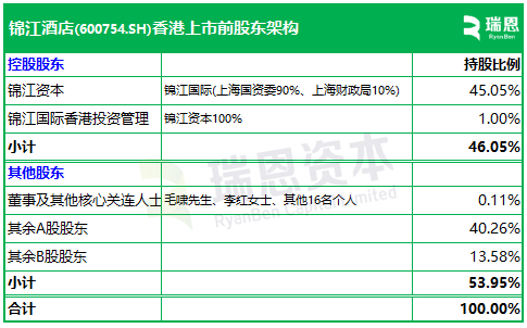 上海国资委、上海财政局分别间接持股90%、10%的锦江资本,以及其旗下锦江国际香港投资管理,合计持股46.05%,为控股股东。