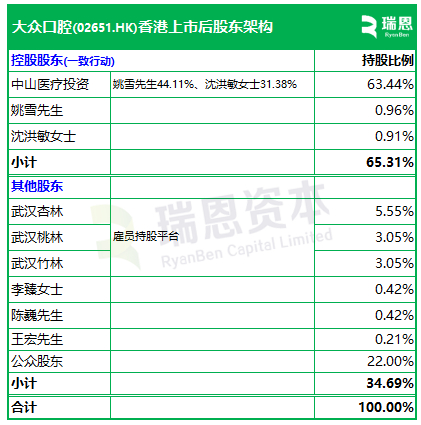 招股书显示,大众口腔在上市后的股东架构中,姚雪先生、沈洪敏女士一致行动,他们直接及通过中山医疗投资合计持股约65.31%,为控股股东。
