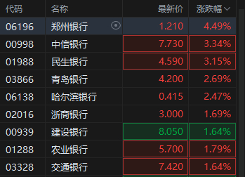 7月2日消息,港股内银股普遍拉升,其中,郑州银行涨4.49%,中信银行、民生银行涨超3%,青岛银行、哈尔滨银行涨超2%,建设银行再度刷新历史新高。