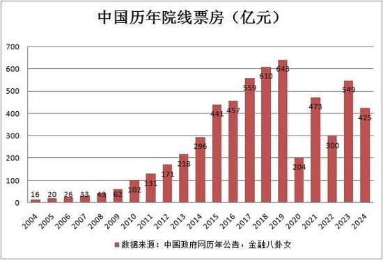 要从票房来看,去年也就425亿,比前年少124亿。八妹给大家做了个表格,我们的票房之前一直都是一路高升,在2015年就已经超过440亿了,2017年559亿,2019年最高峰达到643亿。