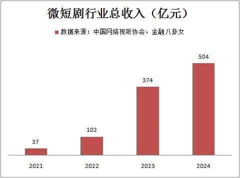 看看数据,微短剧行业总收入。21年的时候才37亿,两年时间翻了10倍,2023年已经374亿了,去年达到504亿。