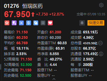 7月9日消息,恒瑞医药港股午后进一步拉升,一度涨超18%报71.15港元,创上市新高。截止发稿,恒瑞医药涨12.87%,报价67.95港元,成交额逾4亿港元。