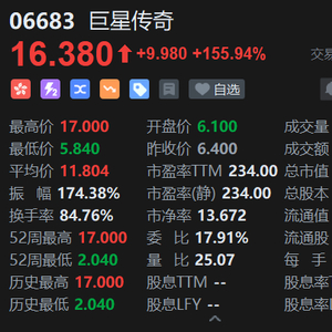 7月9日消息,巨星传奇(6683.HK)午后涨幅进一步扩大,一度拉升涨165.62%,报17港元,截至目前,巨星传奇涨155.94%,报价16.38港元,成交额放大至86亿港元,位居港股第三位,仅次于国泰君安国际和阿里巴巴。