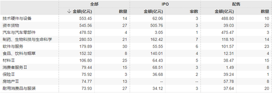 Wind显示,在Wind二级行业分类下,技术硬件与设备、资本货物、汽车与汽车零部件这三大行业是募资规模前三名;后续则还有制药、生物科技与生命科学,软件与服务,食品、饮料与烟草,材料Ⅱ等行业的募资规模超过百亿港元。