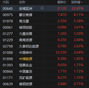 7月18日消息,港股煤炭股普遍上涨,安域亚洲涨超22%,蒙古焦煤涨超6%,南戈壁涨超5%,中国神华、南南资源等涨超2%。