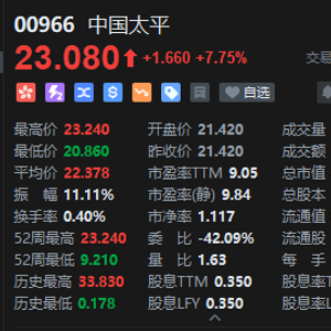 中国太平午后直线拉升涨超8%,公司预计2025年盈利增长超215%,摩根大通上调目标价至30元