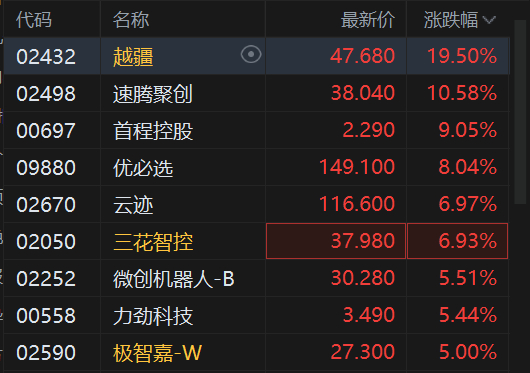 2月20日消息,港股机器人概念股集体走强,其中,越疆涨超19%,速腾聚创涨超10%,首程控股涨超9%,优必选涨超8%,云迹、三花智控涨超6%,微创机器人、力劲科技涨超5%。