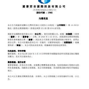 国泰君安国际在公告中强调,目前公司整体业务及运营,包括投资银行业务在内的所有业务板块,均维持正常开展。公司同时表示自身财务稳健,各项经营活动均合规有序地进行。