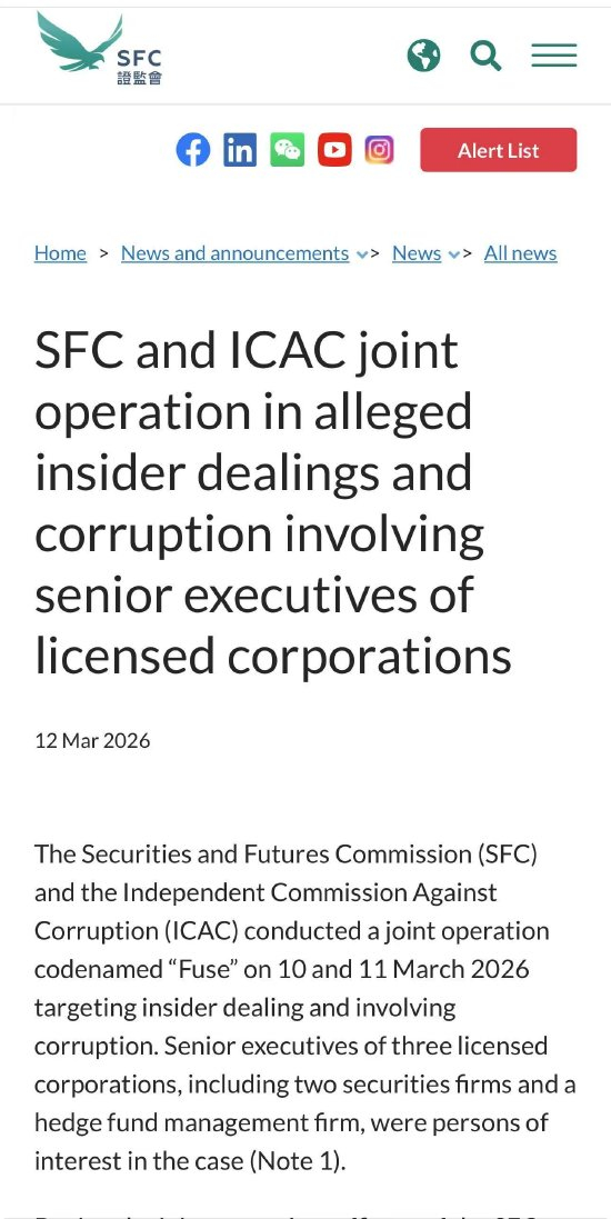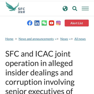 香港廉政公署及证监会:2家证券公司、1家对冲基金高层涉嫌内幕交易及贪污