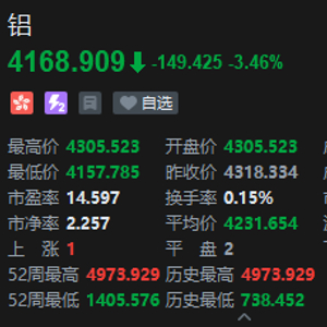 3月18日消息,港股铝业股持续走低,其中,俄铝绩后大跌逾11%,中国铝业跌近4%录得4连跌,中国宏桥跌超2%,南山铝业国际跌1.46%。