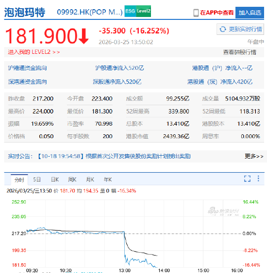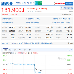 2026年3月25日,泡泡玛特(09992.HK)在发布2025年年度业绩报告后,午后股价出现大幅跳水,现跌超16%。