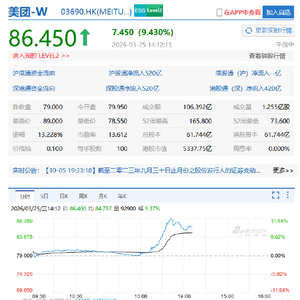 3月25日消息,美团(03690.HK)股价午后大幅拉升,盘中一度涨超11%。截至发文,美团报价86.45港元,成交额逾106亿港元。