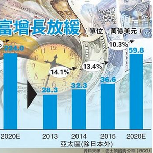 不计日本,亚太区财富增长主要由中国及印度带动,预计未来5年财富增长将占全球逾四成。报告预计,亚太区将在明年超越西欧,成为世界第二大富裕地区。但事实上,全球经济不稳对亚太区财富增长也有所拖累。该机构曾在2014年全球财富报告中,预测亚太区(不包括日本)将于2016年超越北美成为全球最富裕地区,但如今看来这一“愿望”很难成为现实。