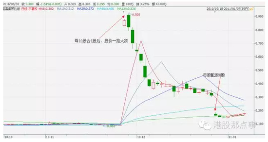 看上图,高富集团(0263.HK)曾于2010年11月26日每10股合1股,股价之后大跌,随即公司又在2010年12月29日每股配股8股,这是明显的妖股自救伎俩。该股在2016年6月13日又宣布拟进行“一供二”供股,供股价0.25元较最后收市价0.49元折让约48.98%。